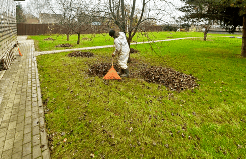 Комплекс осенних работ по подготовке участка к зимнему периоду: уборка опавшей листвы, удаление сухой травы и растительных остатков, очистка газонного покрытия.